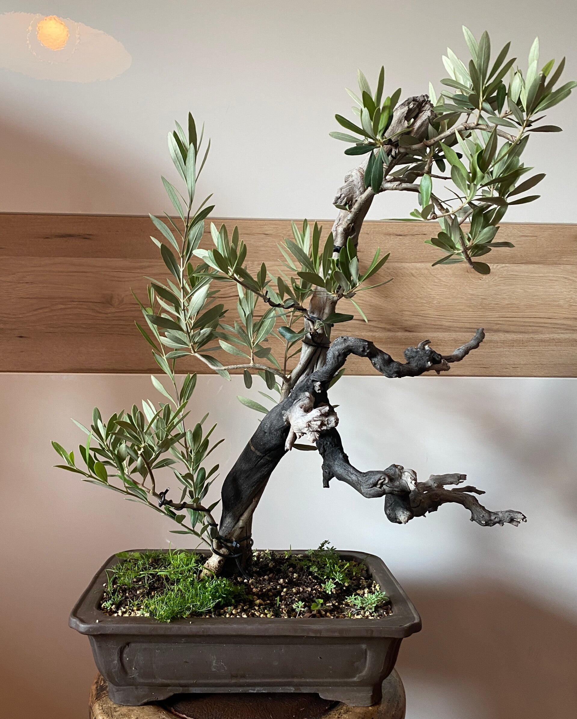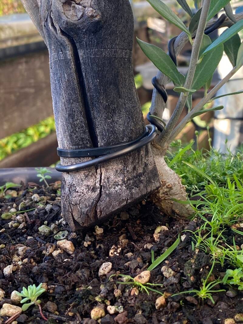 Jetzt, nach guten zwei Jahren, fängt die Olive langsam an, in das Totholz einzuwachsen und es sieht eigentlich recht gut aus. Allerdings hat sich gezeigt, dass ich bei der Erstgestaltung einen Fehler gemacht habe, weil ich das Totholz bündig mit der damaligen Substratoberfläche angelegt habe. Ich hatte mir gedacht, so das Vermodern des Totholzes zu vermeiden. Aber im Laufe der zwei Jahre hat sich das Substrat abgesenkt und dadurch ist auf der Rückseite eine deutliche Lücke entstanden. Jetzt könnte man natürlich einfach wieder Erde auffüllen oder einen geeigneten Stein als Gestaltungselement einbauen, ich werde aber versuchen die Lücke mit lebendem Olivenholz zuwachsen zu lassen. Dazu biege ich im Zuge des anstehenden Sommerschnittes einen starken Trieb, den ich normalerweise wegschneiden würde, mit Draht unter das Totholz. Die Idee dahinter ist, dass sich durch das Dickenwachstum des Astes die Lücke langsam füllt und eventuell an seiner Unterseite Wurzeln sprießen, die zusätzliche Stabilität geben. Den Ast selber werde ich nicht einkürzen, sondern nach dem Entdrahten im Tanuki-Stil am Totholz entlangführen. Mal sehen, ob das klappt!