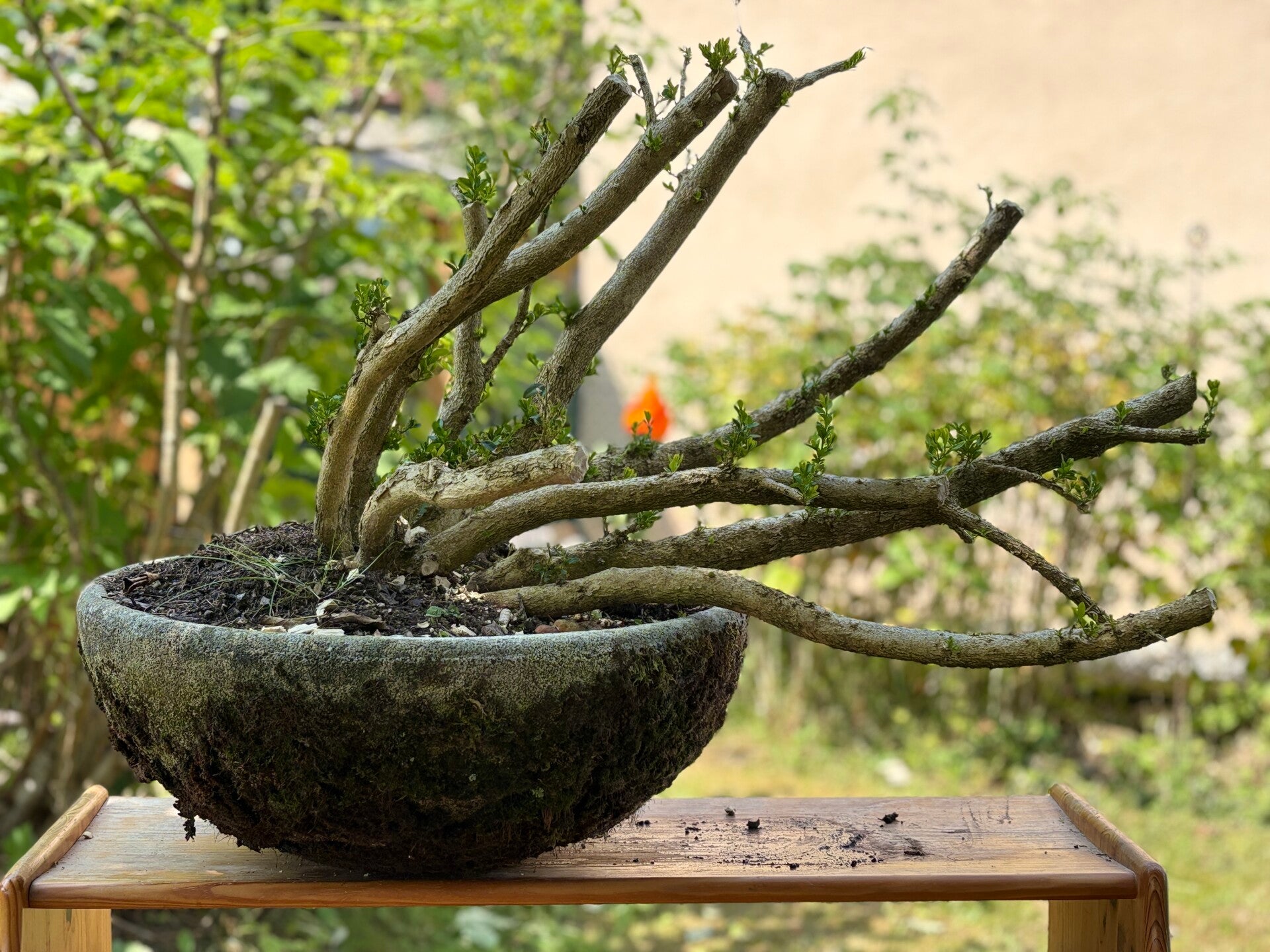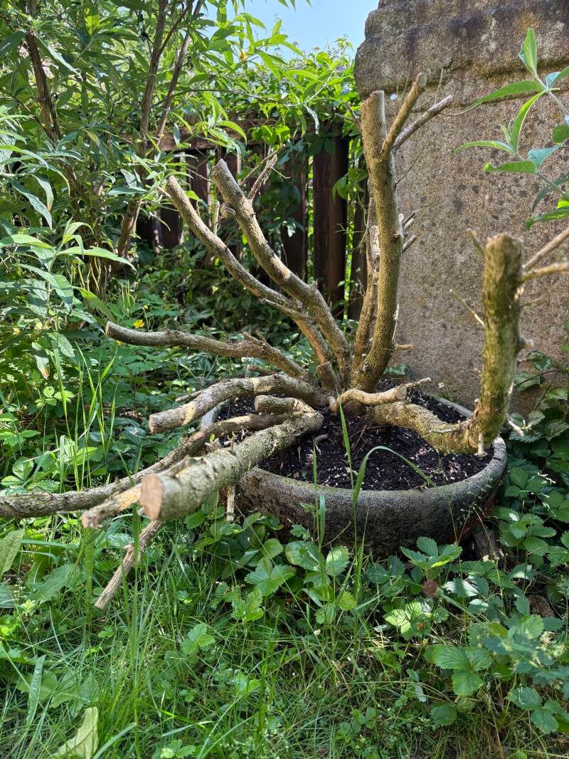 Vor zwei Jahren ist in meinem Garten der Buchsbaumzünsler über meinen alten Buchsbaum hergefallen und hat ihn praktisch kahlgefressen. Ich hatte gehofft, dass er sich vielleicht erholt, weil die Raupen ein wenig Grün übrig gelassen haben, aber nachdem sie sich auch letztes und dieses Jahr wieder über die spärlichen Triebe hergemacht haben und mir statt eines dichten Strauches ein mannshohes Skelett im Garten hinterlassen haben, muss ich wohl zu drastischeren Maßnahmen greifen. Also hab ich den Buchsbaum wüst zurückgeschnitten, ausgebuddelt und in eine Betonschale gesetzt, in der Hoffnung, dass er überlebt. Sollte das klappen, könnte daraus ein echt cooler Bonsai werden…! To be continued….