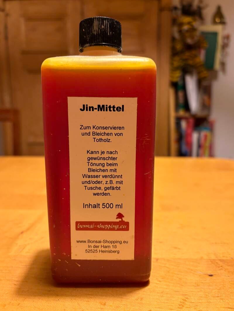 Totholz an deinen Bonsais wirkt erst so richtig gut, wenn es ausgebleicht wird und so den Eindruck eines lange stark verwitterten Astes erweckt. Dadurch lässt du den Baum optisch künstlich altern. Man kann das natürlich der Zeit überlassen, oder ein wenig nachhelfen, indem du die Totholzpartien mit Jin-Mittel bestreichst. Das Mittel enthält Schwefel und färbt das Totholz zunächst gelbich, aber nach einigen Wochen verliert sich der Gelbton und das Totholz färbt sich grau bis weiß. Neben der Färbung wirkt das Mittel auch antibakteriell und schützt das Holz vor Fäulnis. Da das Mittel die ersten Tage ziemlich stark stinkt, würde ich dir empfehlen, die Totholzgestaltung damit nur im Freien und bei Kalthaus- oder Indoor-Bonsais nur im Frühling und Sommer zu machen, wo du sie auch ein paar Tage im Freien belassen kannst. Das Zeug ist bestimmt auch nicht besonders gesund, darum trage ich bei der Anwendung immer Einmalhandschuhe und Maske 😷…!